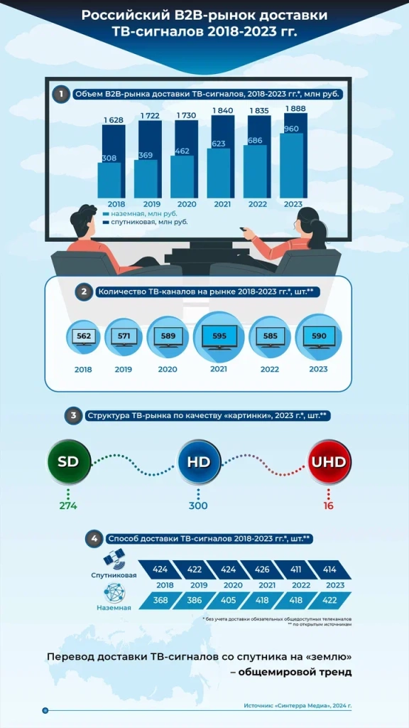 Компания «Синтерра Медиа», цифровой партнер индустрии производства, обработки и доставки медиаконтента, проанализировала развитие российского B2B-рынка доставки ТВ-сигналов с 2018 года по 2023 год. В исследовании учитывались как данные из открытых источников, так и собственные данные экспертов «Синтерры Медиа».